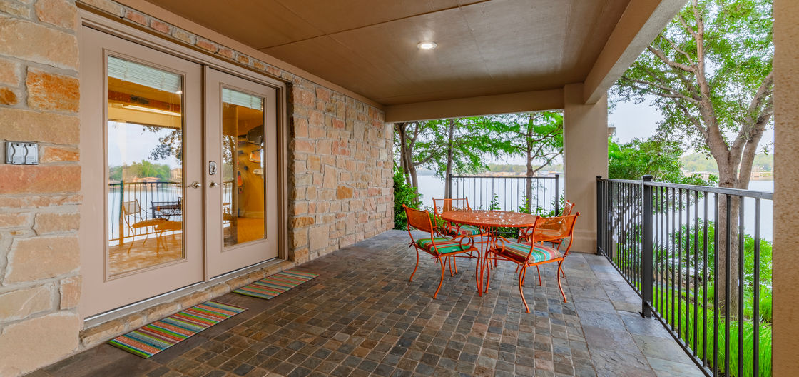 Appx 6,000 sq ft Lake LBJ waterfront home on 206’ of big, deep open water w/ panoramic lake views. Built in 2004 w/ extensive remodels in 2014 and 2023 this one-of-a-kind property includes 5 bedrooms, 5 1/2 baths, living & 2 dining areas. Features include solid granite kitchen counters, stainless appliances, hickory & bamboo hardwood floors, travertine & slate floors, tone-on-tone, 6 refrigerators, & 6 HD flat screen TVs. The kitchen includes a Wolf dual fuel range & a 48" built-in refrigerator. It also has an enormous pantry w/ a second 36" refrigerator & prep counter. Fresh ground & brewed coffee is available from the built-in Bosch automatic coffee/latte/espresso machine. Abundant granite counter spaces include a huge black solid granite farmhouse sink & a rectangular prep sink with automatic water & garbage disposal features. Prep sink doubles as a beverage tub/server. Close by is the bar with wine refrigerator & icemaker.